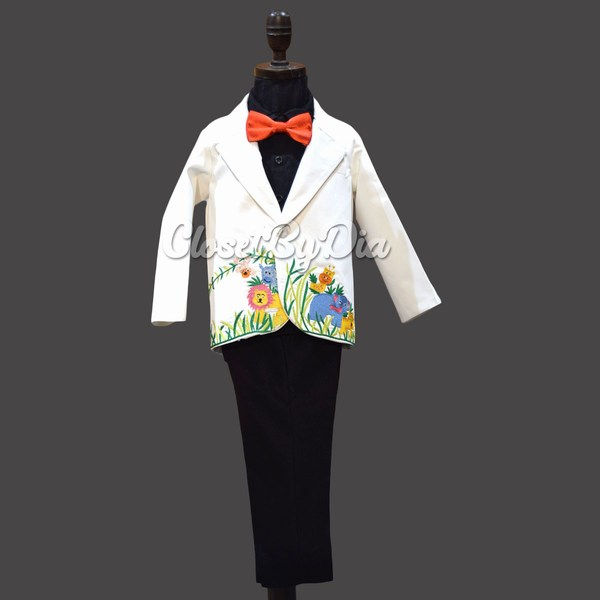 Celebrate the Safari jungle themed birthday party with this unique jungle safari 1st birthday outfit for boys. This white colored coat with jungle themed embroidery is paired with black shirt and pants and also includes a bowtie. We created this birthday boy outfit as a perfect choice for an upcoming birthday party, first birthday and photo shoots.